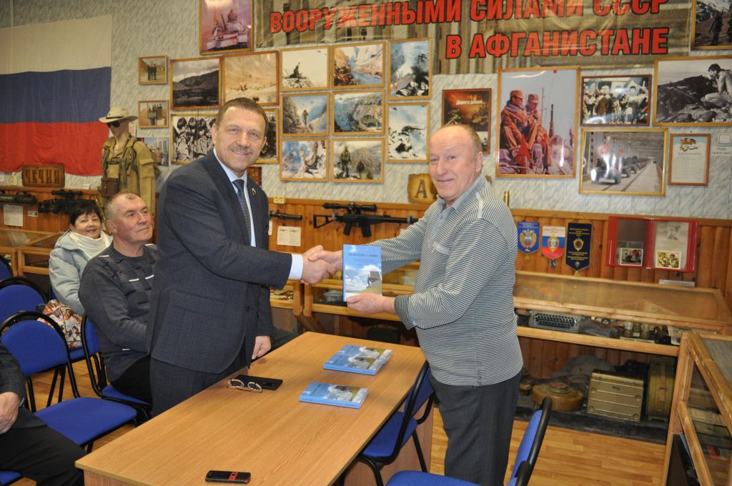 Редактор-составитель Н. Макаров вручил книги авторам А. Альховику, В. Бодрединову, В. Дееву и герою одного из очерков В. Мартынову.