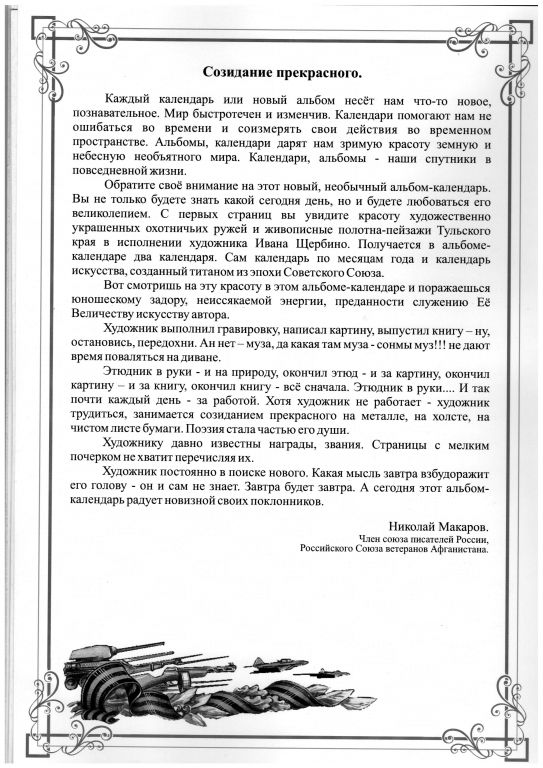 Обратите своё внимание на этот новый, необычный альбом-календарь. Вы не только будете знать какой сегодня день, но и будете любоваться его великолепием. С первых страниц вы увидите красоту художественно украшенных охотничьих ружей и живописные полотна-пейзажи Тульского края в исполнении художника Ивана Щербино. Получается в альбоме-календаре два календаря. Сам календарь по месяцам года и календарь искусства, созданный Титаном из эпохи Советского Союза.
