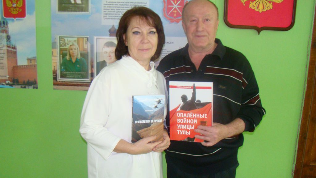 Писатель подарил школе (директор ОЛЬГА ГОЛЬДАРБ) авторские книги с дарственной надписью: «Они воевали за Речкой» и «Опалённые войной улицы Тулы».