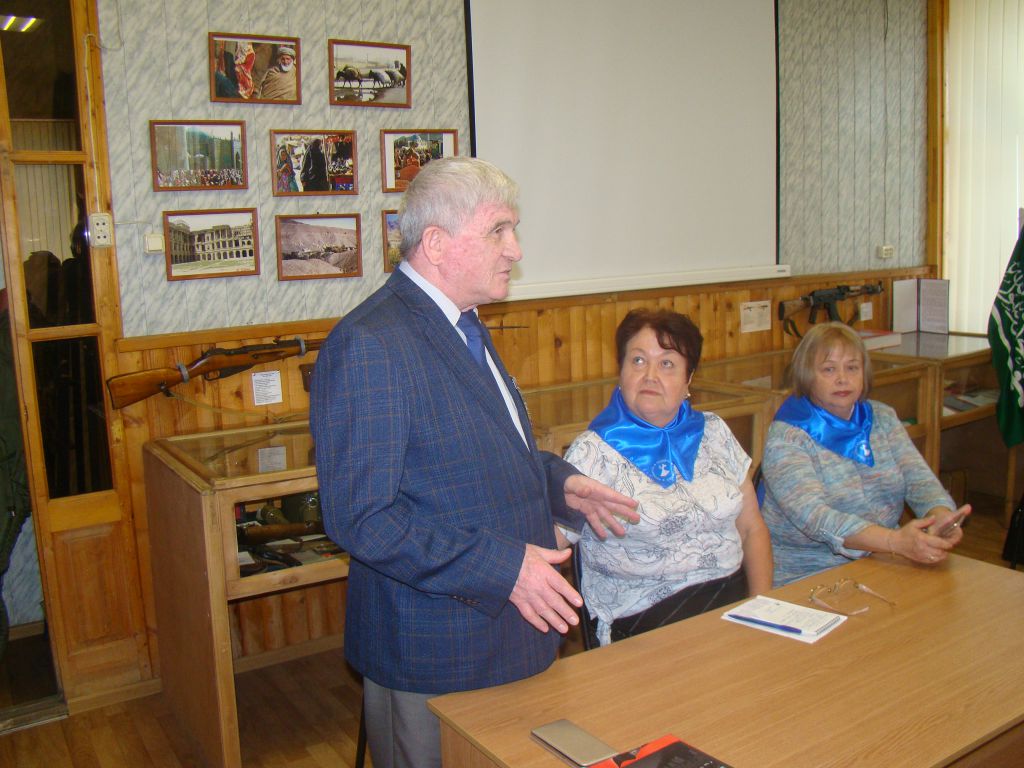 Провели мероприятия участники боевых действий в Афганистане Бодрединов В. Т., Макаров Н. А. и председатель Совета ООО «Семей погибших защитников Отечества» Тарунтаева Н. И.