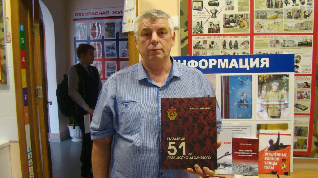 По окончании урока писатель подарил авторские книги преподавателю ОБЖ Михаилу АЛЁХИНУ (гвардии подполковник в отставке, афганец) «Артиллеристы и создатели вооружения земли тульской» и «Детство, отрочество, юность военного врача Макарова».